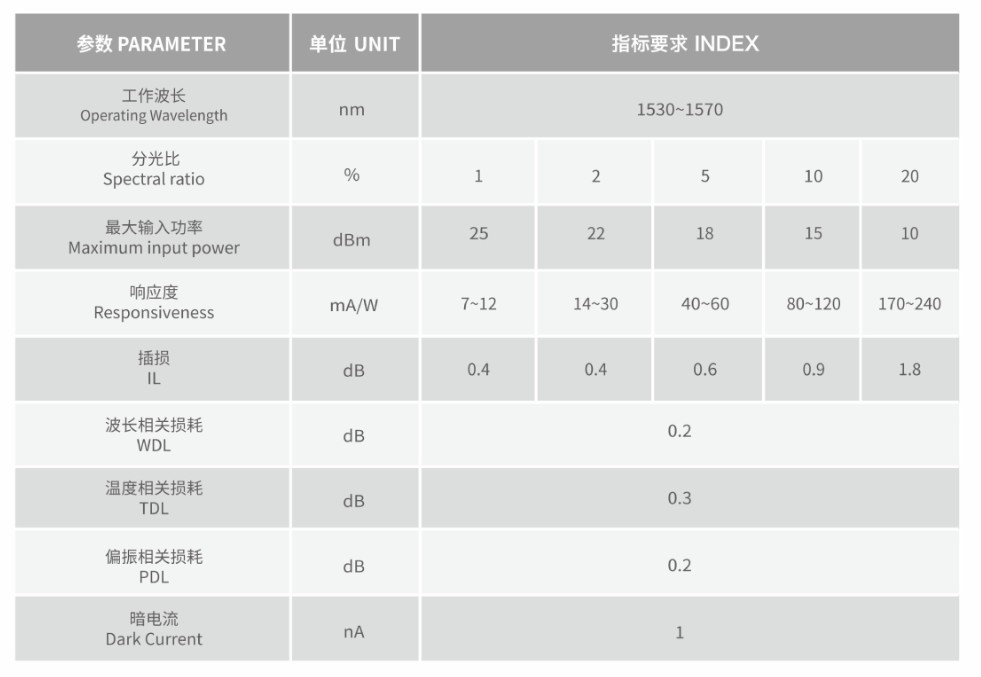 雙芯尾纖式結(jié)構(gòu),實(shí)現(xiàn)一定比例的光透射到探測器,其余的光反射到另一根光纖。用于WDM網(wǎng)絡(luò)監(jiān)控、光纖放大器、光開關(guān)等。